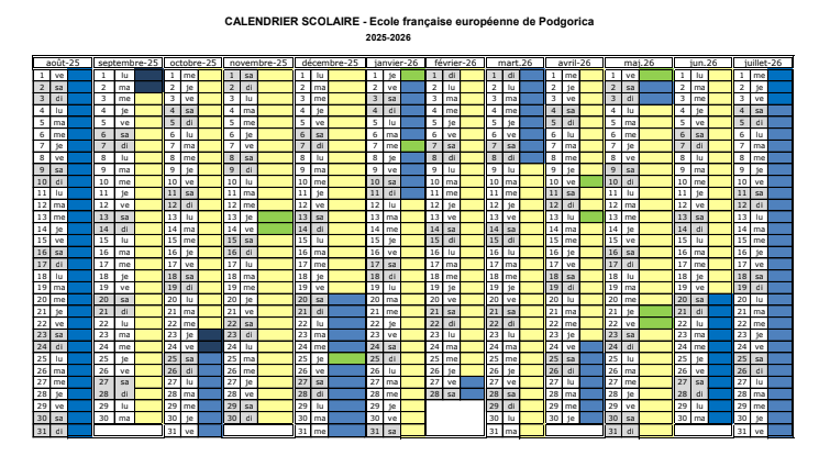 Le calendrier annuel est défini chaque année, en respectant une répartition sur 36 semaines d’école, en accord avec les directives du ministère de l’éducation nationale français, de l’AEFE et du calendrier monténégrin. Il est voté par le conseil d’école.
